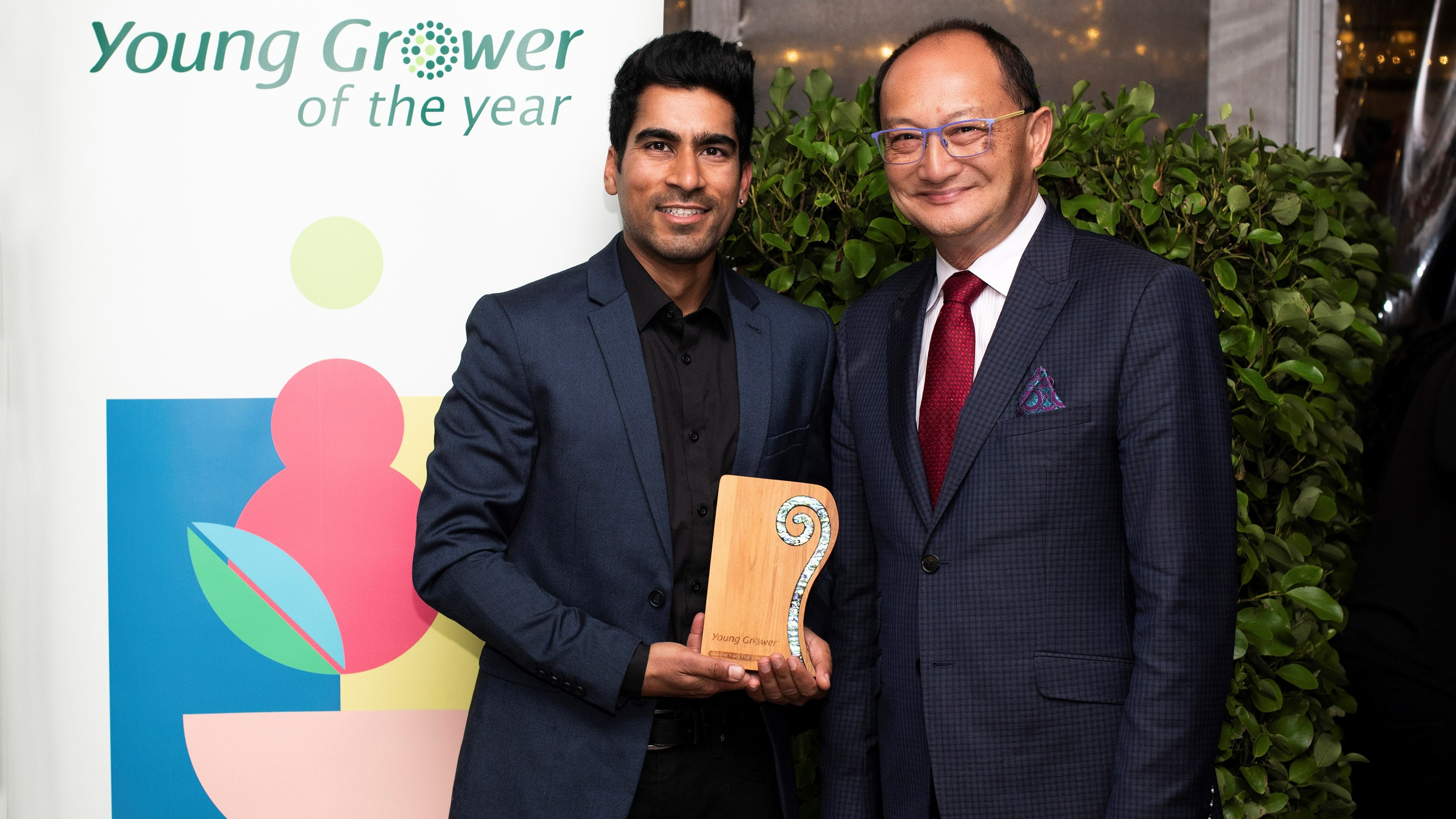 Maninder Singh (left, with Meng Foon, right, who MC-ed the awards dinner) has won the title of Gisborne Young Grower of the Year for 2022.
